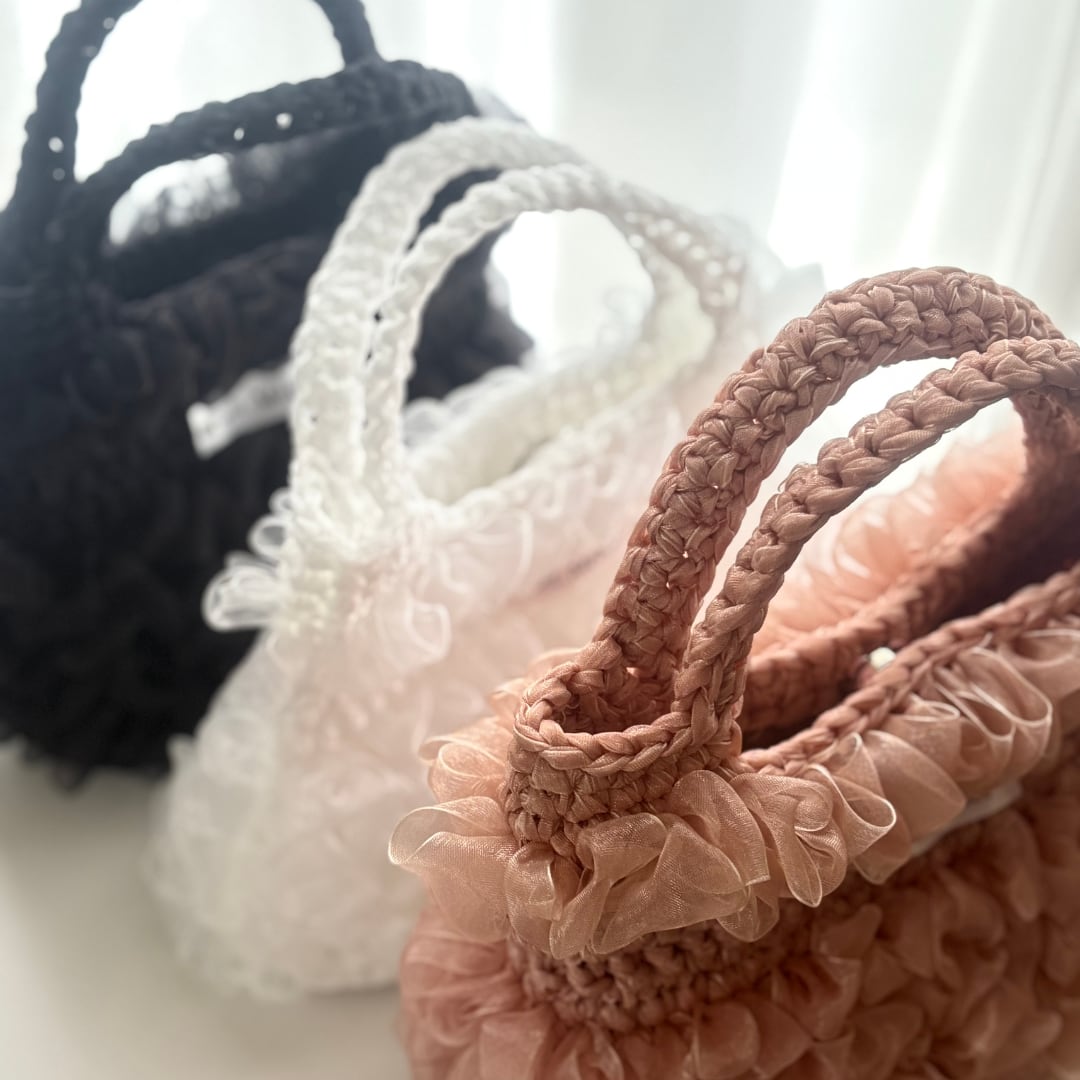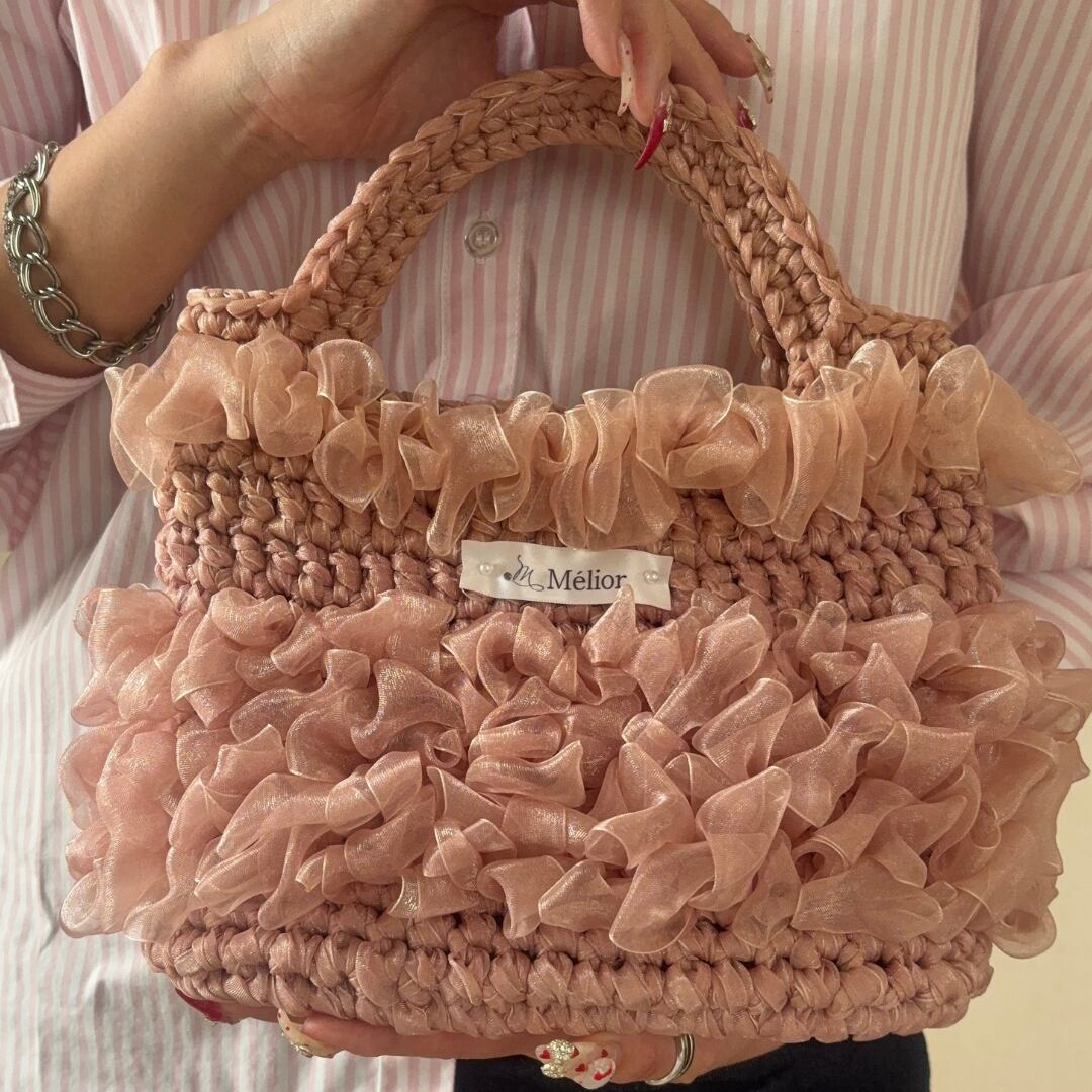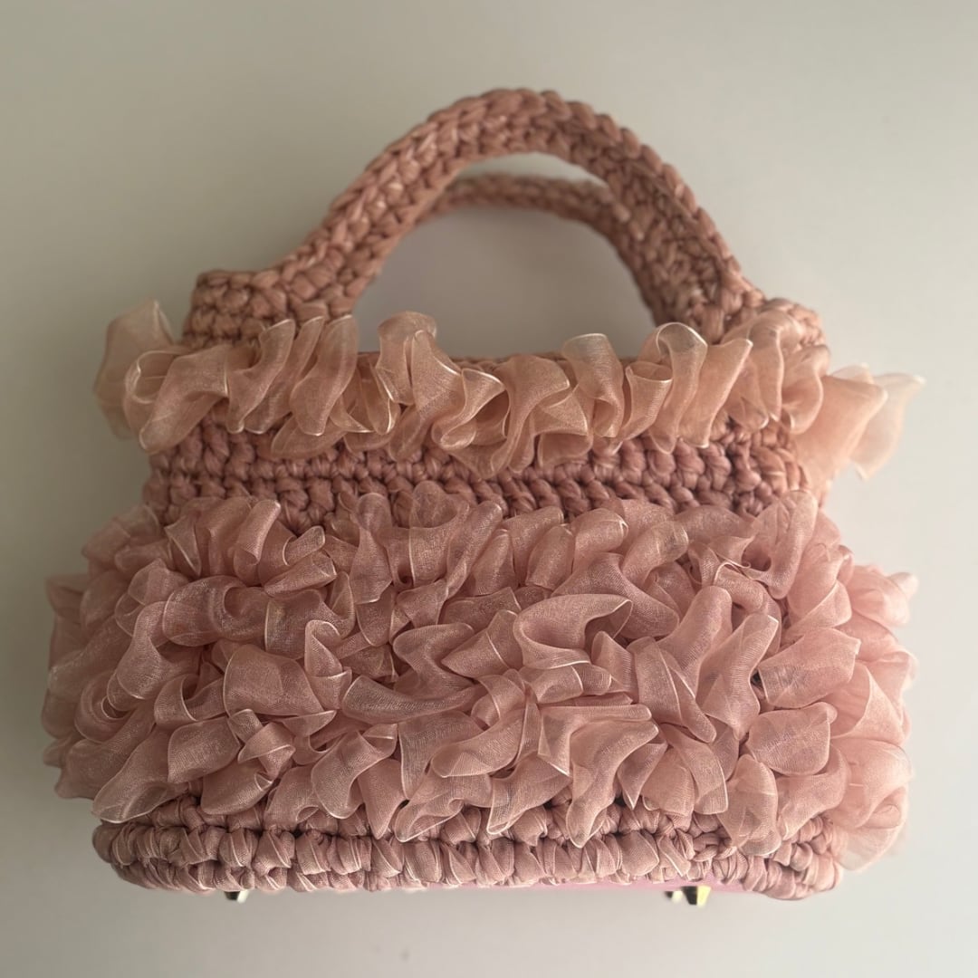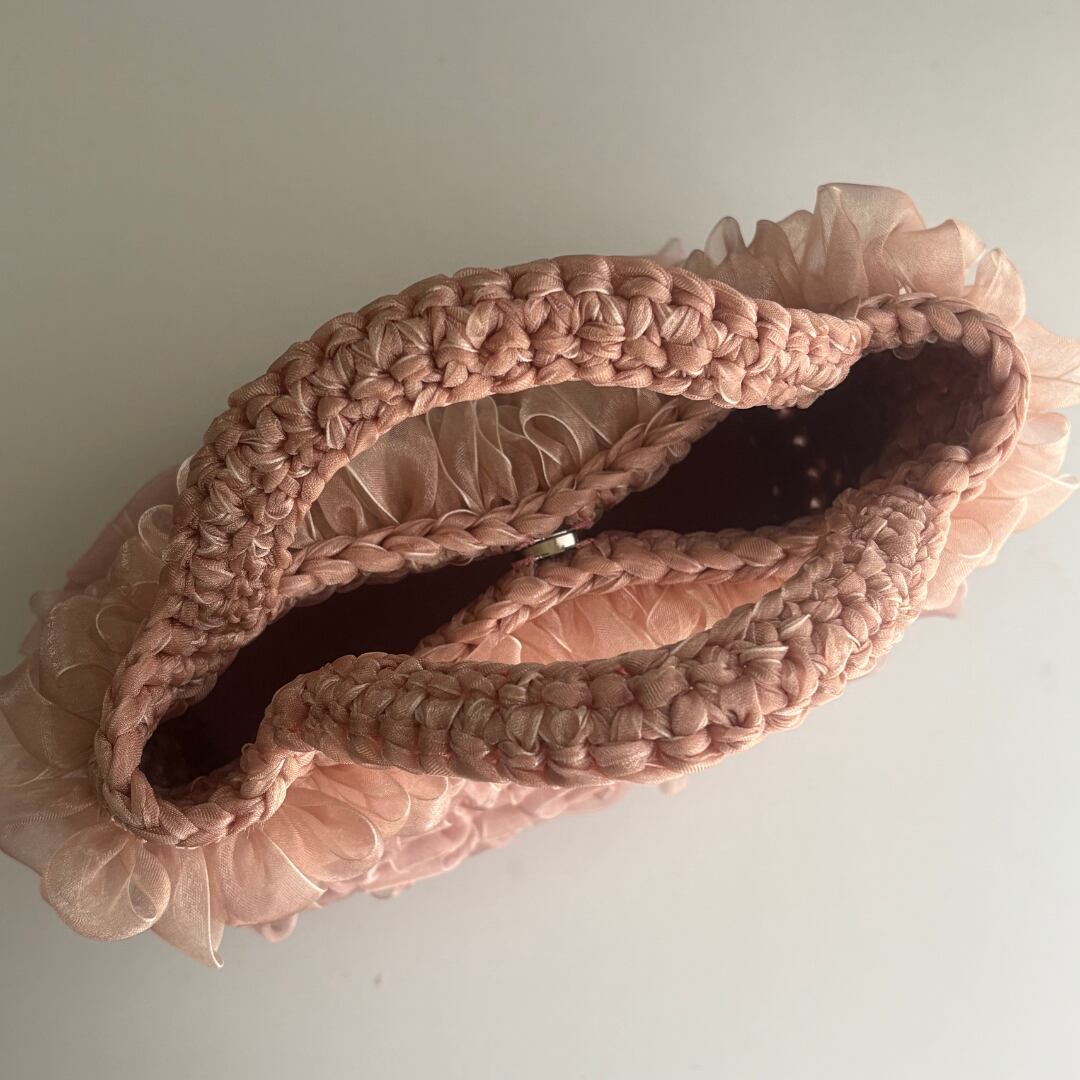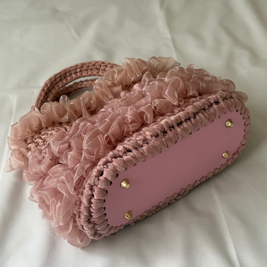 くすみピンクのオーガンジーリボンを使用した手編みのハンドバッグです。