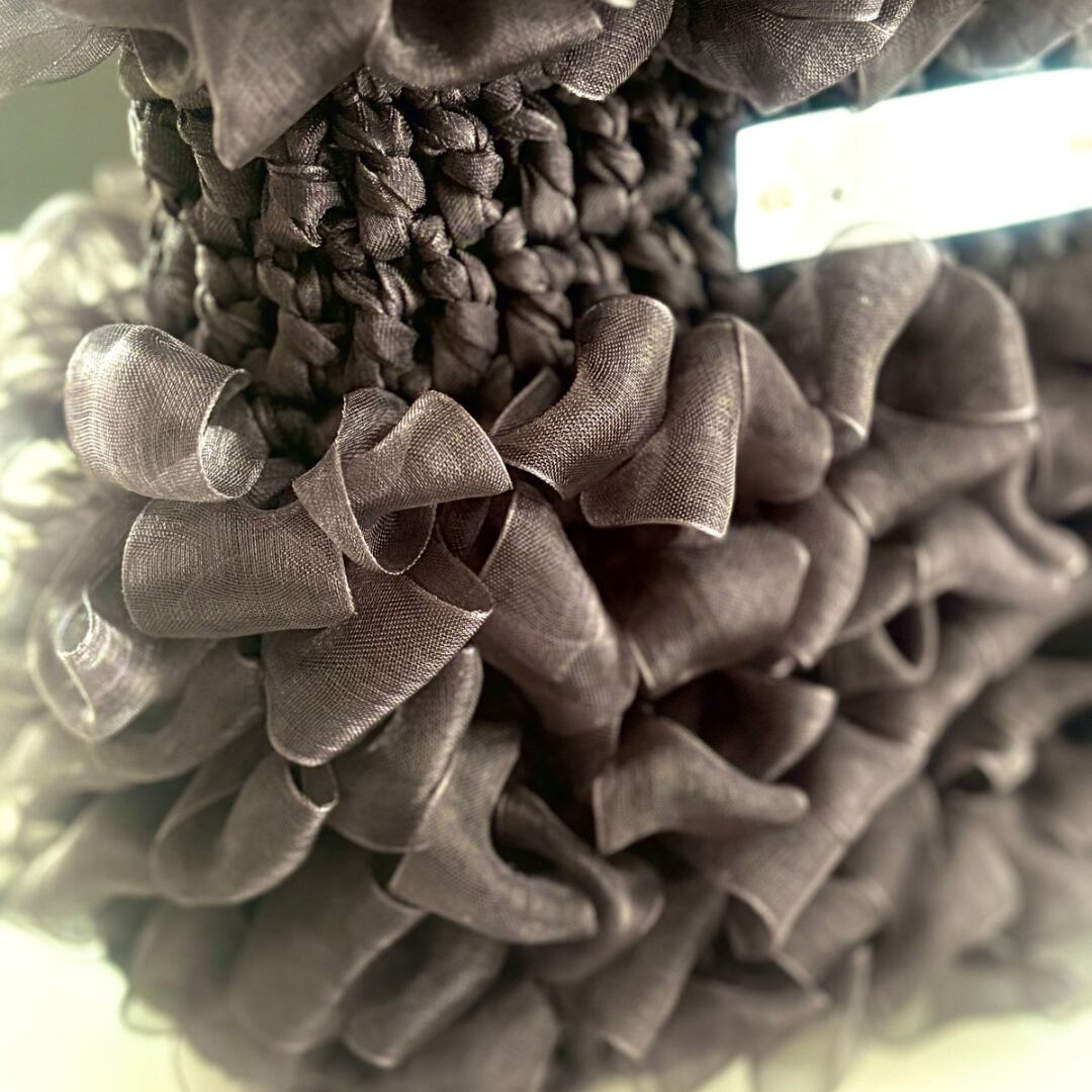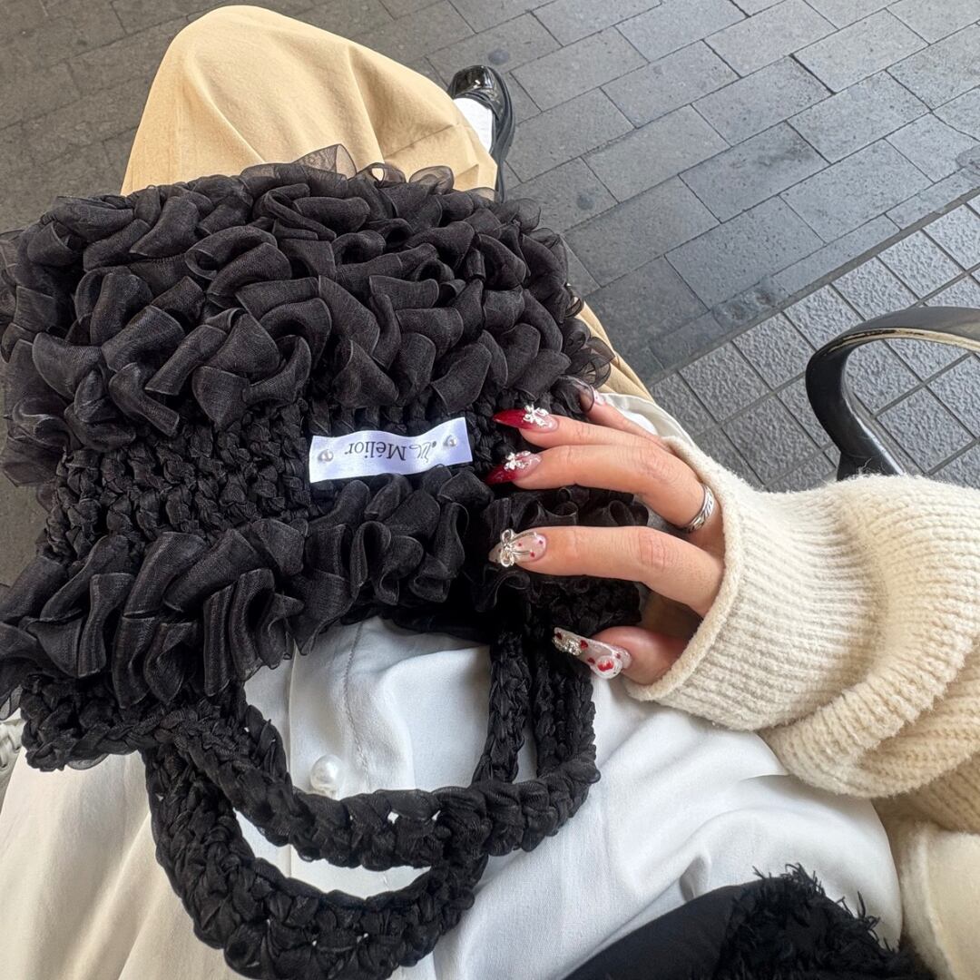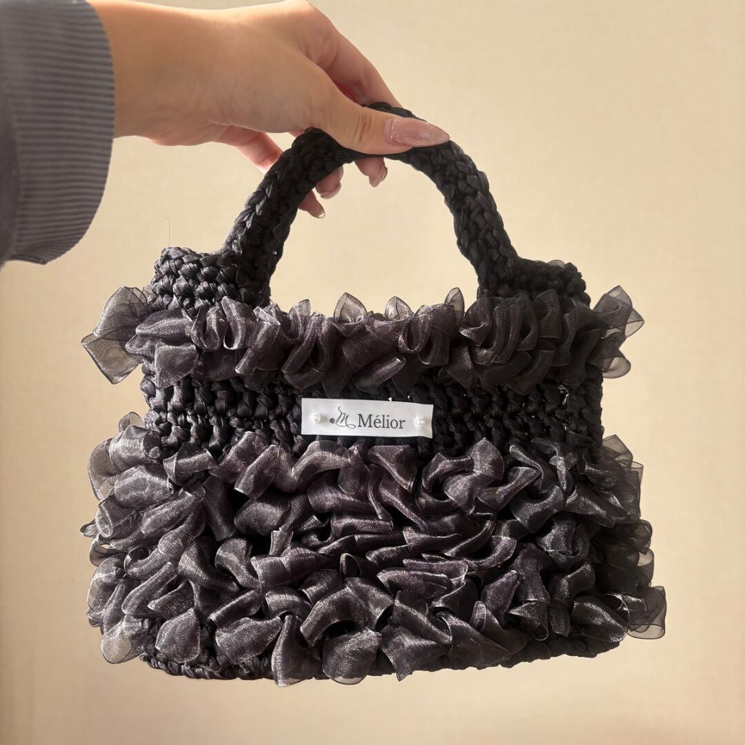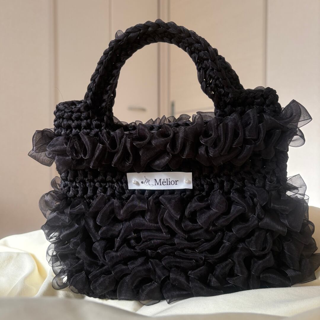 深みのあるブラックに、柔らかく揺れるオーガンジーフリルを重ねた、シックで洗練された佇まいのハンドバッグです。
