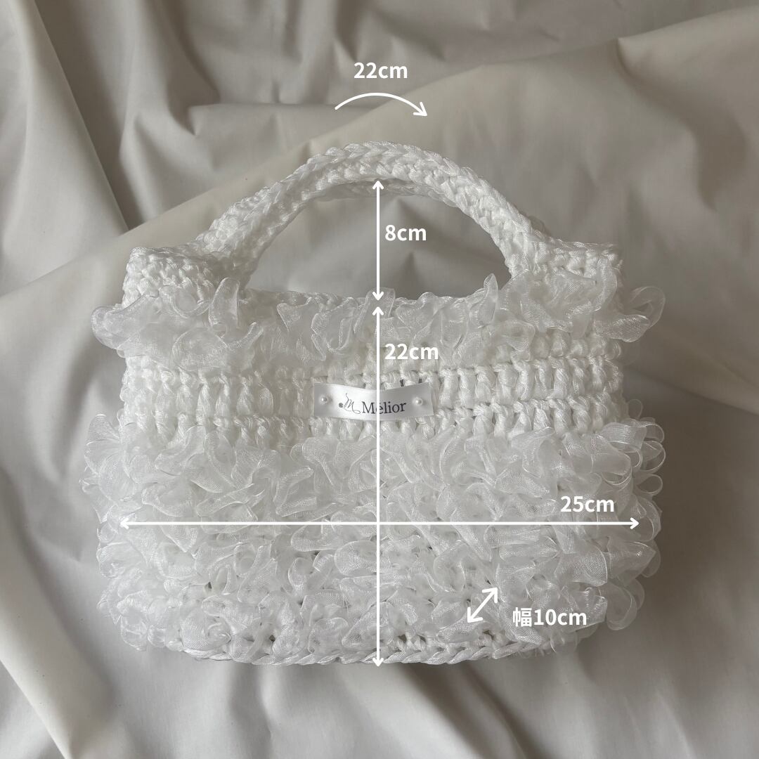 やさしいホワイトにオーガンジーフリルを重ね、透明感のある上品な佇まいに仕上げたハンドバッグです。