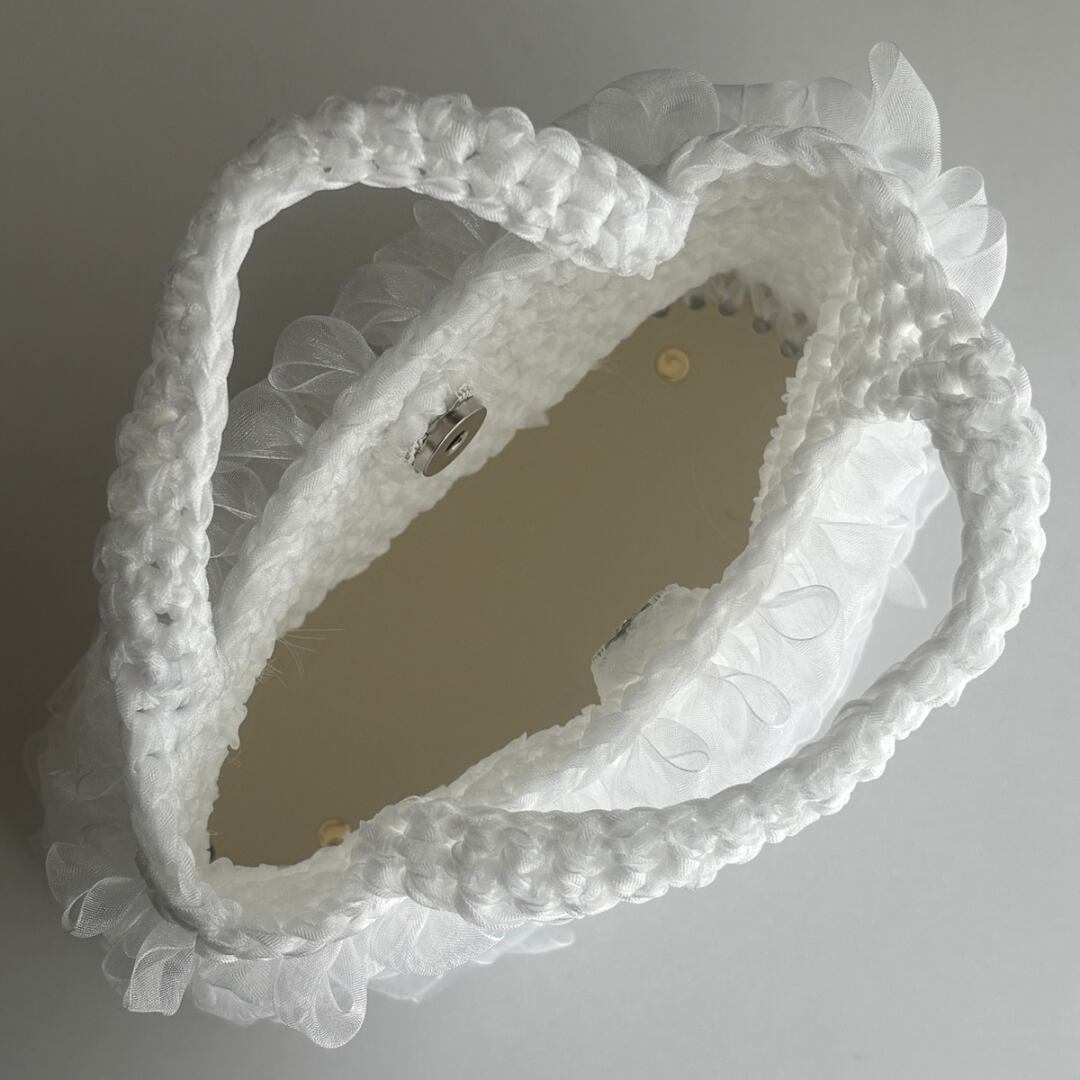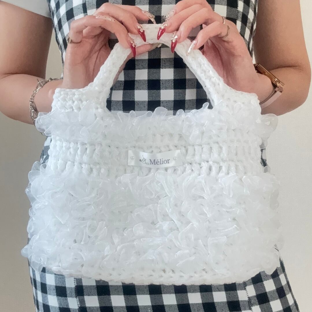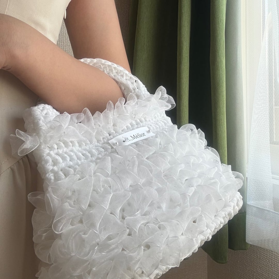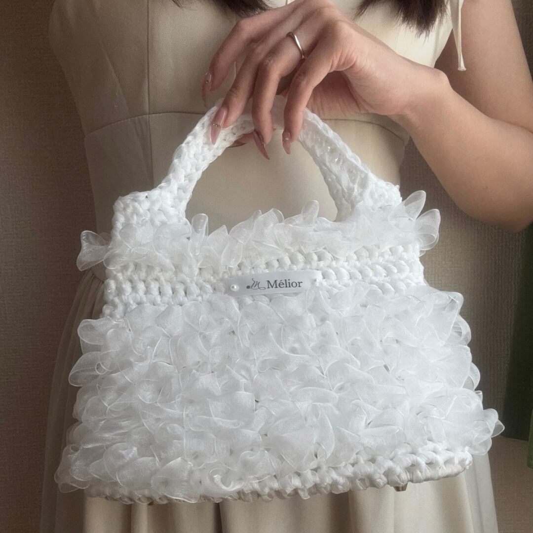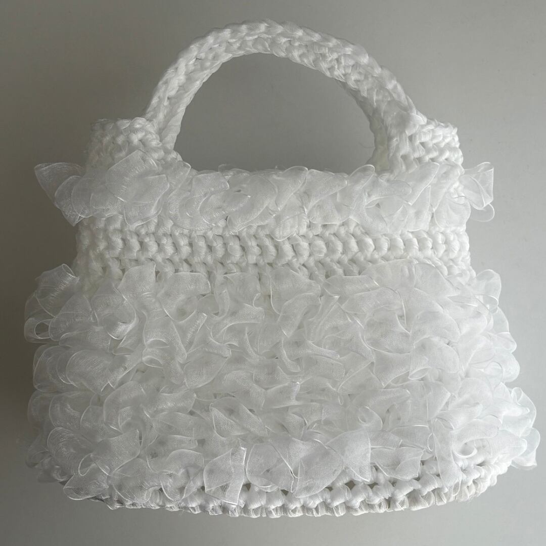 白のオーガンジーリボンを使用した手編みのハンドバッグです。
